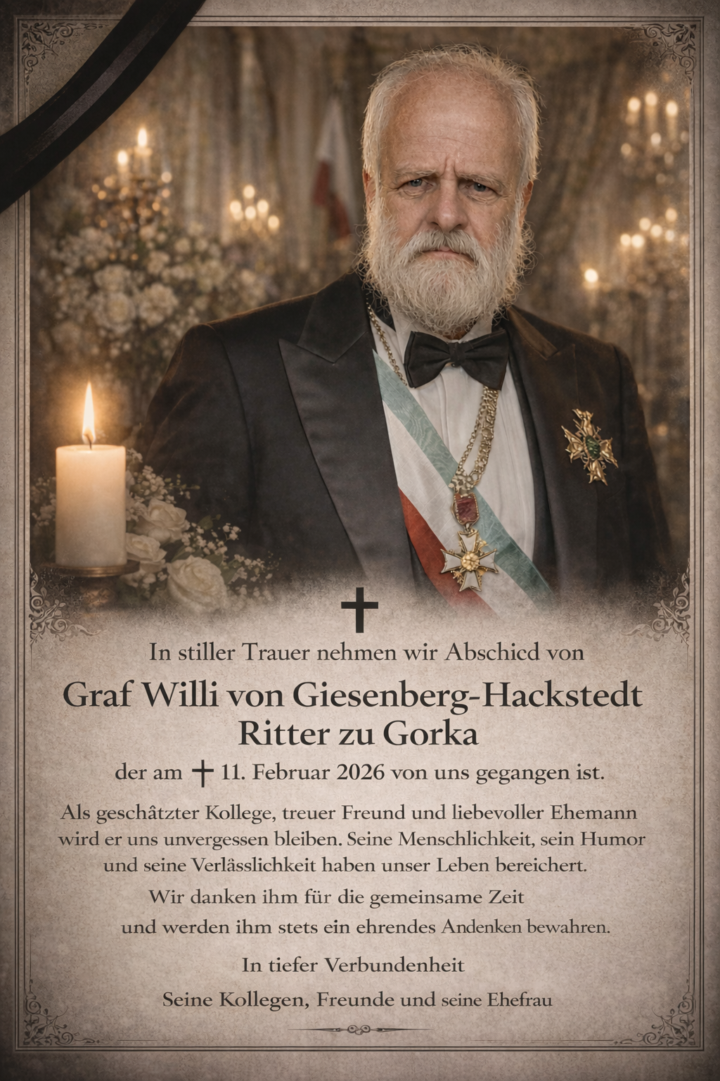 Im Namen Seiner Hoheit Fürst Michael von Gorka Prinz Rurikovich wird die Reaktivierung und Nobilitierung von Willi Giesenberg-Hackstedt zum polnischen Grafen Willi von Giesenberg-Hackstedt Ritter zu Gorka, feierlich bekannt gegeben.