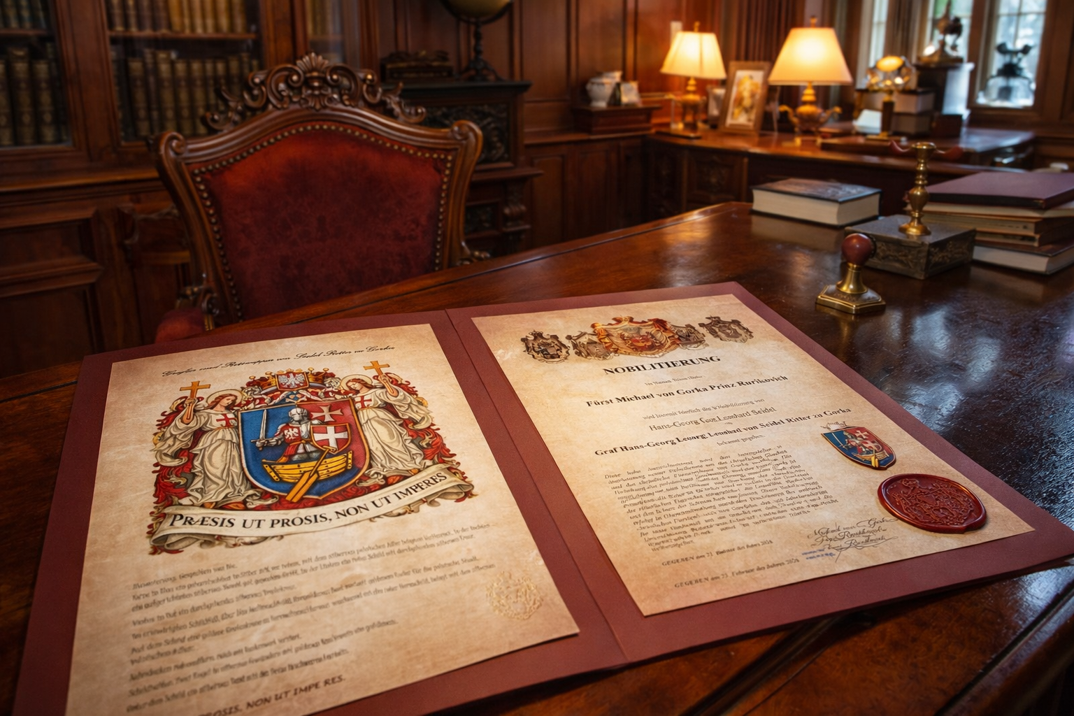 Im Namen Seiner Hoheit Fürst Michael von Gorka Prinz Rurikovich wird die Nobilitierung von Hans-Georg Leonard Seidel zum polnischen Grafen und Ritter zu Gorka, feierlich bekannt gegeben.