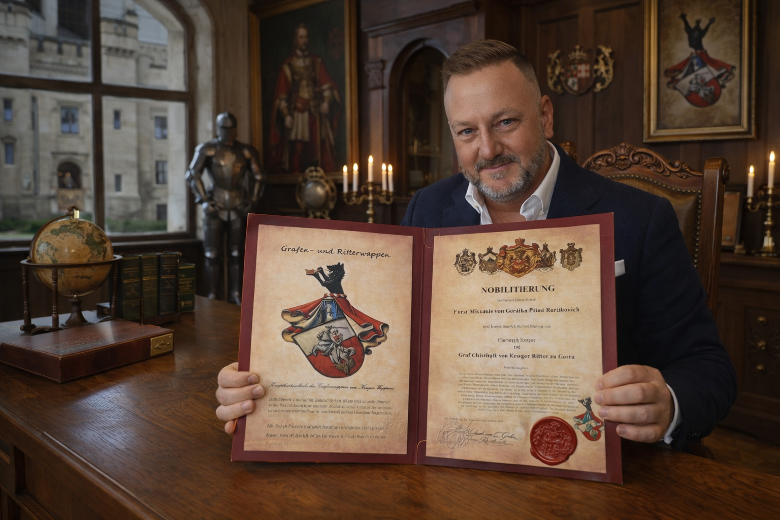 Im Namen Seiner Hoheit Fürst Michael von Gorka Prinz Rurikovich wird die Nobilitierung von Christoph Krüger zum polnischen Grafen von Krüger Ritter zu Gorka feierlich bekannt gegeben.
